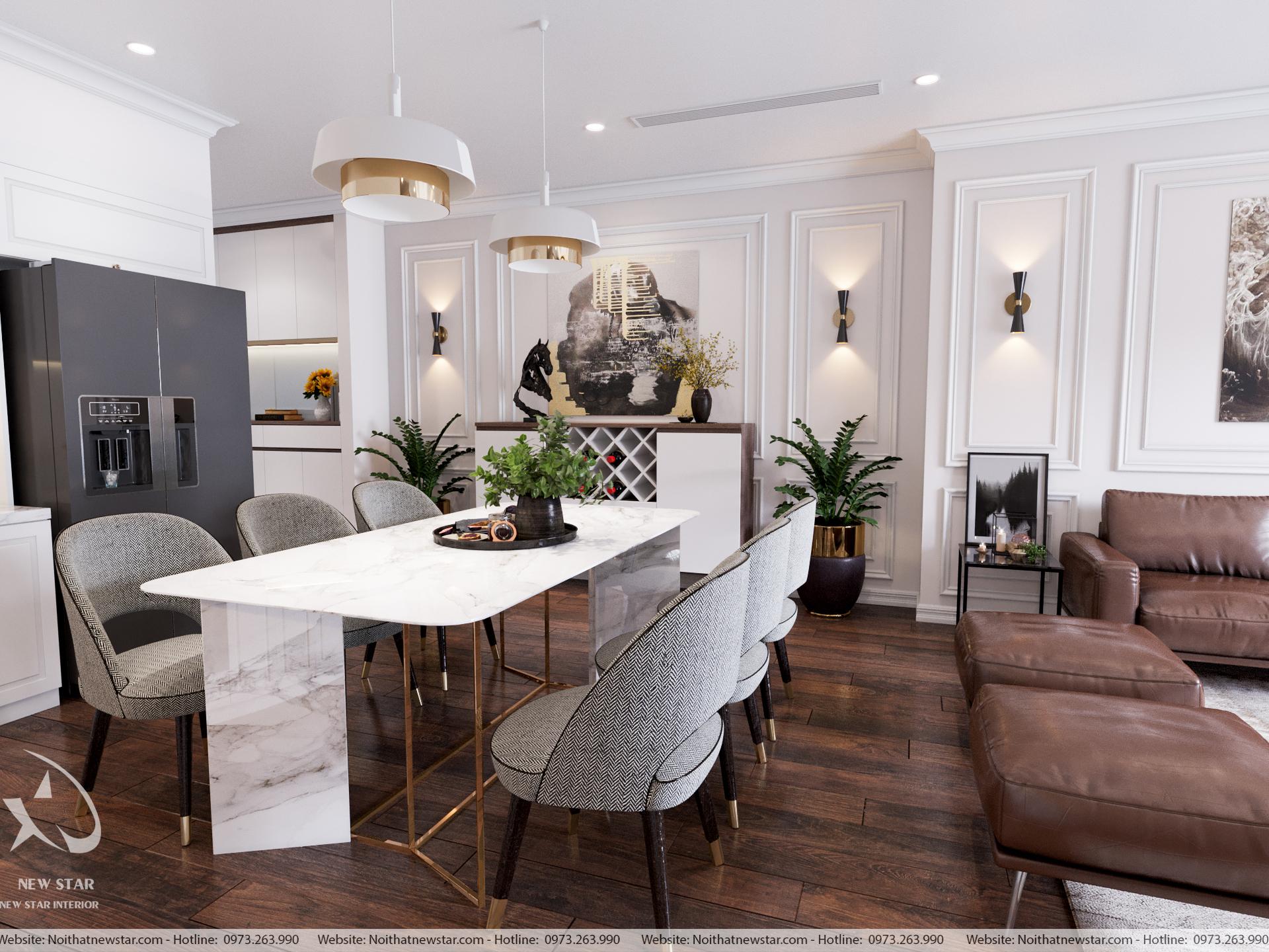 Thiết kế phòng ăn với tông màu ấm áp, kết hợp hài hòa làm tăng thêm vẻ sang trọng cho căn hộ