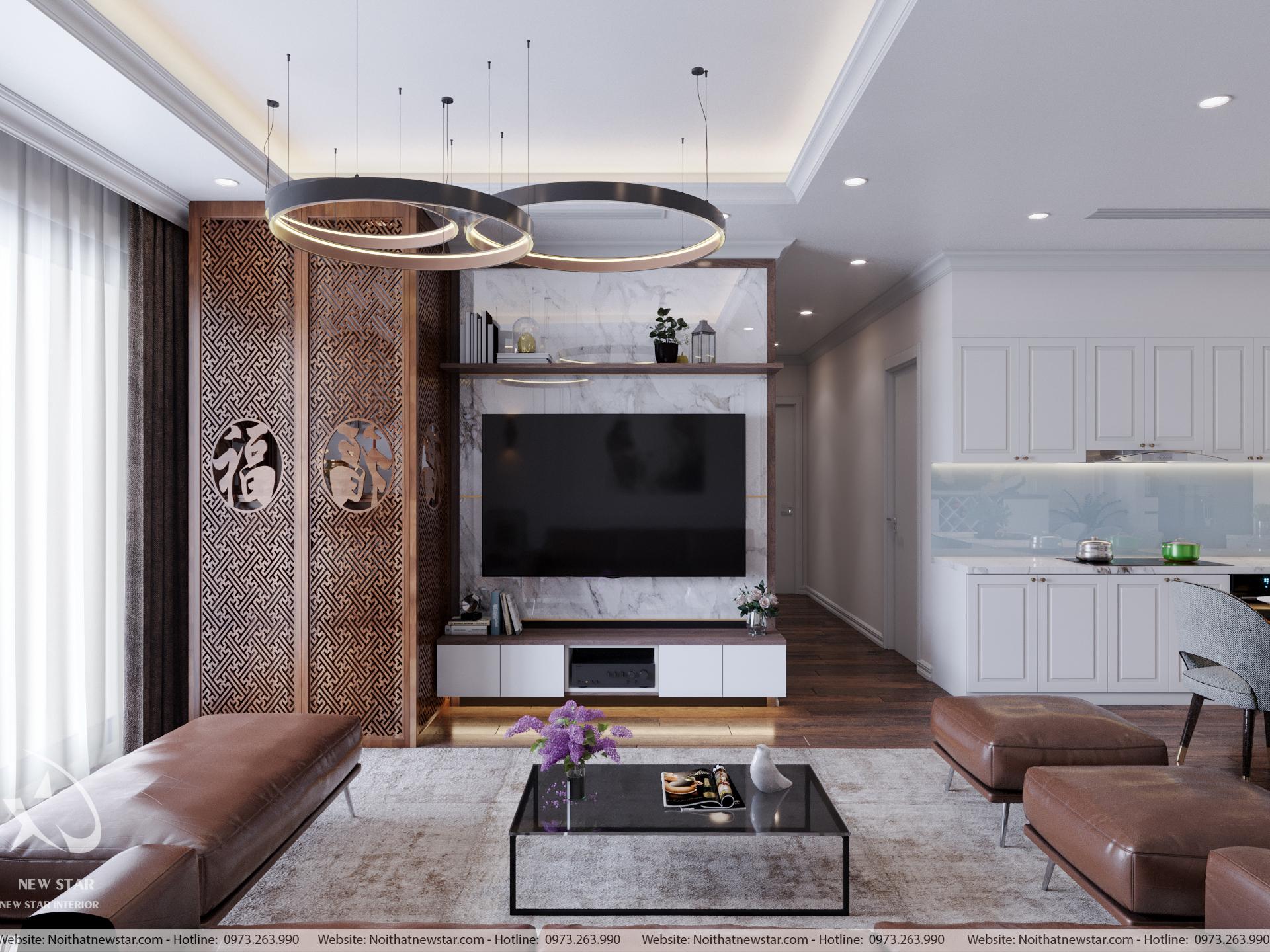 Phòng khách được bố trí liền kề với gian bếp vô cùng thoải mái và thoáng mát, với thiết kế nội thất không gian mở càng làm cho căn phòng trở nên rộng hơn. Nội thất được bố trí hợp lí, sofa lớn kết hợp với 3 sofa đơn tạo nên sự cân bằng cho căn phòng, bố cục không bị cứng, đồng thời tạo được các khoảng không hợp lí cho không gian phòng khách.