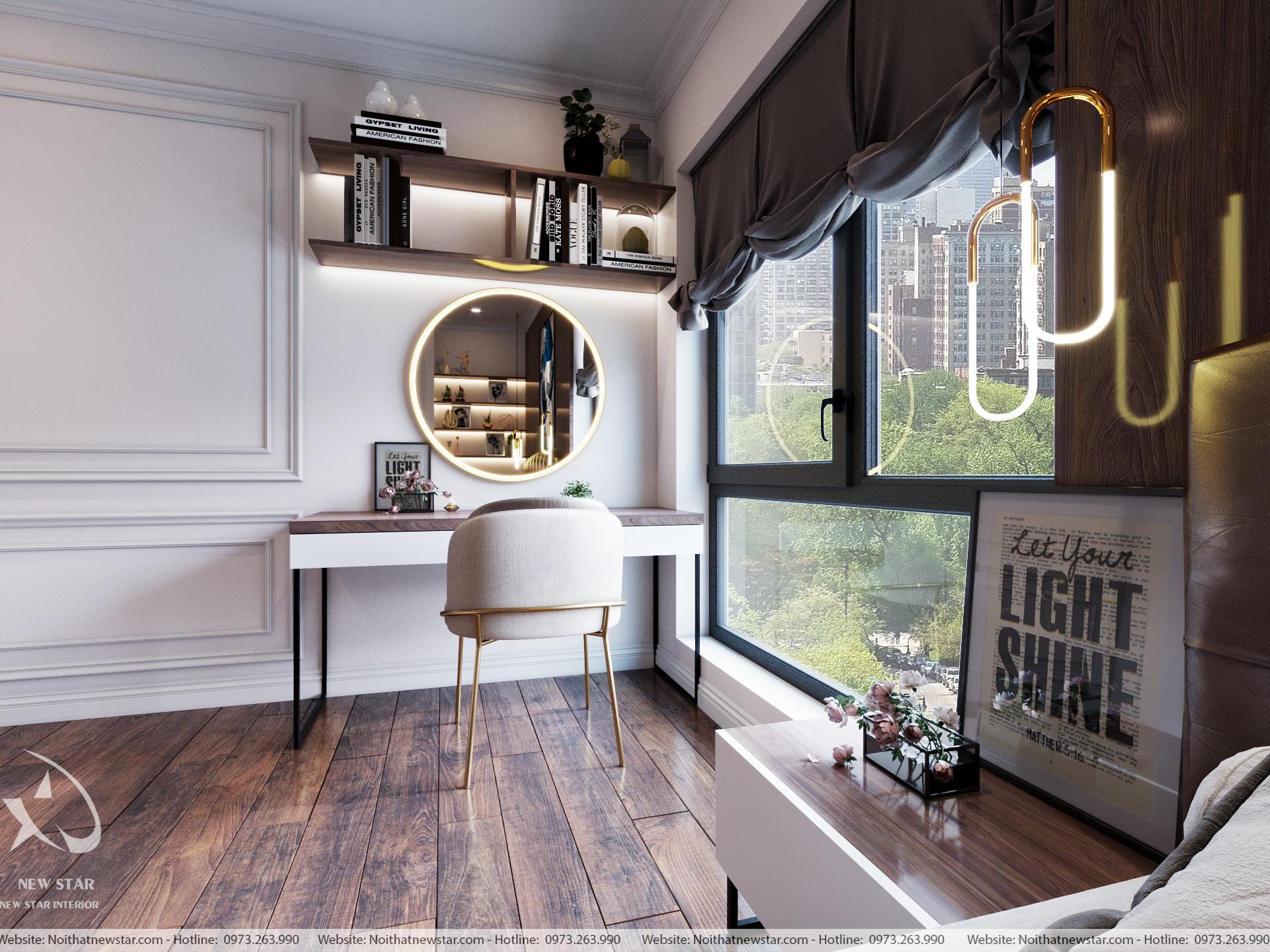 Phòng ngủ lớn của gia chủ được thiết kế cùng tông màu ghi xám, đề cao sự đơn giản và cảm giác bình yên là điều ta dễ dàng cảm nhận được qua cách KTS sắp xếp. Các đồ nội thất trong phòng đều có sự đồng nhất về màu sắc, sử dụng thiết kế nội thất thông minh như bàn trang điểm gắn tường, tủ âm tường… tạo nên sự thuận tiện và tối đa sự tiện nghi được thu hẹp trong không gian ngủ, nhấn mạnh vào vẻ đẹp sang trọng và tinh tế.
